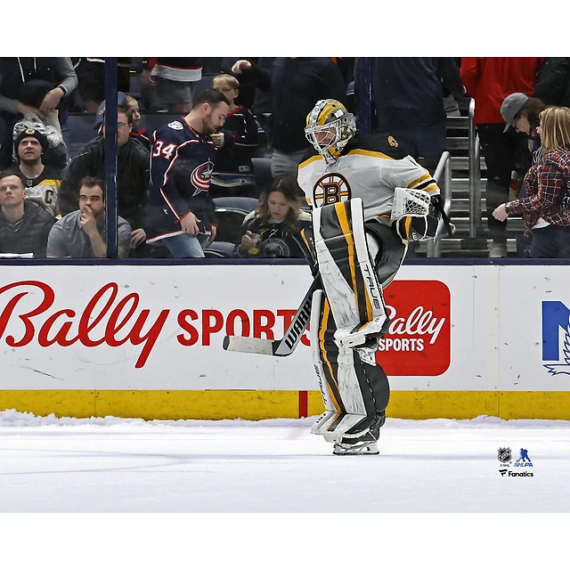 Jeremy Swayman, joueur non signé des Bruins de Boston, célèbre sa victoire aux tirs au but