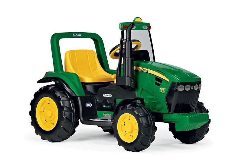 The John Deere Heavy Duty tractor takes outdoor play excitement to the next level! Kids will delight in driving the large John Deere Heavy Duty Tractor with its extra large stake-side detachable trailer. Children will love loading up the trailer and delivering their treasures. The realistic tractor has a windshield, adjustable seat, and roll bar. Includes 2-Speeds; 2.25 or 4.5 mph, plus reverse. Parents control the speed with the 2nd gear lockout feature. 12-volt rechargeable battery and charger included. Made in the USA, in our Fort Wayne, Indiana factory using domestic and global components.