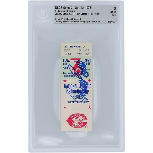 Johnny Bench Cincinnati Reds NLCS Game 3 Beckett Fanatics Witnessed Authentifié 8/10 Ticket du 12 octobre 1976