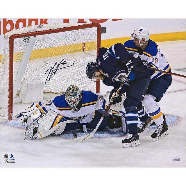 Jordan Binnington St. Louis Blues dédicacé 16" x 20" 2019 Coupe Stanley Playoffs Game 1 Game-Preserving Save vs. Winnipeg Photographie