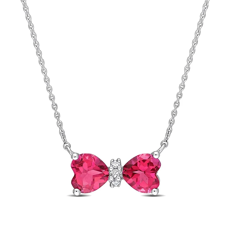 Add a dash of colour to any attire with this pretty pink topaz and diamond accent bow necklace. This charming necklace is crafted in lustrous 10-karat white gold and features two heart-cut, pink topaz gemstones in a prong and channel setting with three round-cut, buttercup diamonds between them to give a chic look. This necklace is suspended on a 17-inch round cable chain secured with a lobster clasp. Polished to a brilliant shine, this necklace will definitely command attention and will surely please your inner princess.
