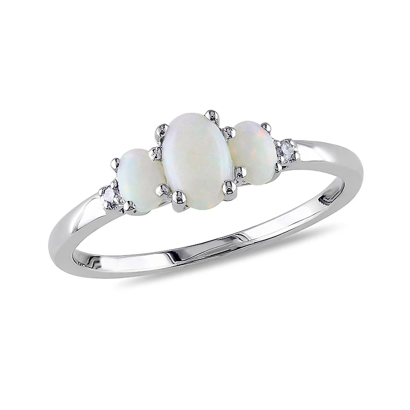 This beautiful Opal and Diamond Three Stone Ring will lend an eye-catching touch of sparkle to your look. A dazzling white gold ring features an oval-cut (6mm x 4mm) opal in the center and oval-cut (4mm x 3mm) opal gemstones with 2 round-cut prong-set diamond accents (G-H, I2-I3) shimmering along the band.