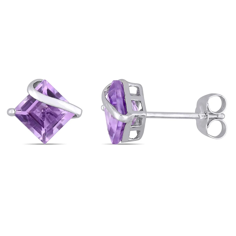 These classic gemstone earrings feature square-cut amethysts with an overlapping swirl. The earrings are set in 10-karat white gold.