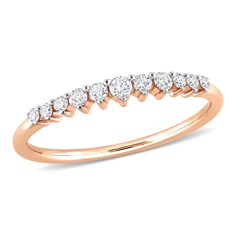 This pretty stackable semi-eternity band is crafted in 14-karat rose gold. This sleek diamond ring features 11 round-cut shimmering diamonds that are beautifully embellished on the ring in a prong setting. Enhanced with a high polished finish, this exquisite style is lovely alone or paired with her diamond engagement ring. This diamond ring is a beautiful reminder of your timeless romance. Celebrate your everlasting love story with this stacking wedding ring.