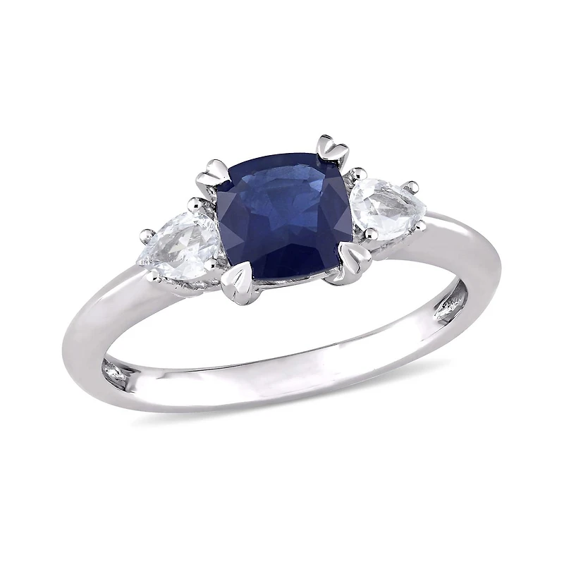 Add a royal appeal to your wedding outfit with this Blue and White Sapphire Three-Stone Engagement Ring. Crafted in luminous white gold, this gleaming engagement ring features a cushion-cut, prong-set vibrant genuine sapphire gemstone (6 x 6mm) at the center, with a pear-shaped, prong-set twinkling white sapphire (4 x 3mm) on each side. Enhanced with a high-polish finish, this sapphire ring is an ideal piece of jewellery for an occasion and is sure to make her shine on her wedding day.