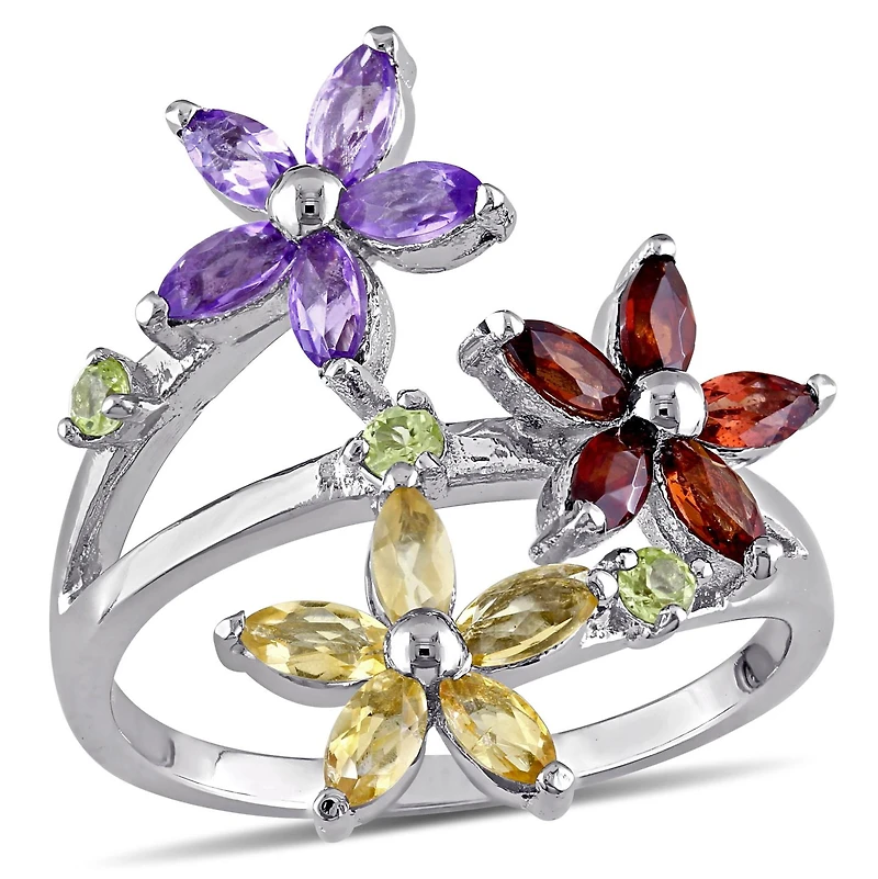 This delightful flower ring features marquise-cut garnet, citrine and amethysts arranged in lovely flower shapes. The ring is accented with round peridot stones and is set in sterling silver.