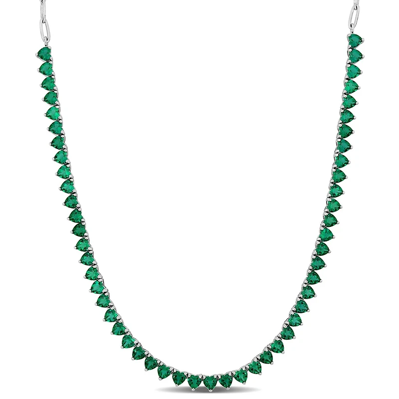 Indulge in the captivating beauty of this exquisite tennis necklace featuring 13 1/3 carats total weight of emerald gemstones crafted in shimmering sterling silver. The alluring green hue of the created emeralds in classic round cut is sure to make a statement and add a touch of sophistication to any outfit. With an adjustable length of 18 inches plus an additional 2 inches, you can customize the fit to your liking. Perfect for formal occasions or to elevate your everyday look, this tennis necklace is a must-have in any jewellery collection.