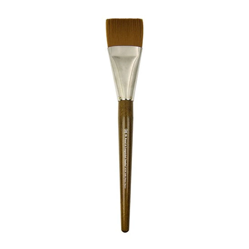 Jumbo Paintbrushes are a great option for artists working on big projects or murals. This collection features large surface brushes in many shapes and sizes. Regardless of medium, three different hair types with various levels of stiffness meet any need. Medium stiffness gold taklon is ideal for thin viscosity paints and perfect for washes, the stiff white taklon is used for medium-bodied oil and acrylic, and the extra-stiff bone taklon is great for heavy bodied oil and acrylic.Jumbo Brown Flat Paintbrushes feature a nickel-plated brass ferrule and a kiln-dried hardwood handle.