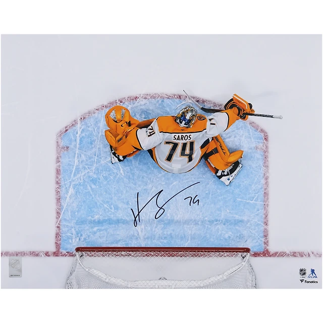 Juuse Saros Nashville Predators Autographed 16" x 20" White Jersey Overhead Making Save Photograph