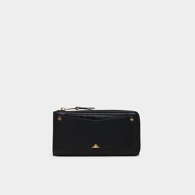 Sleek compact elegance meets daily utility in black leather with gold-tone hardware and a removable wristlet strap allowing quick switch from clutch to crossbody while keeping every card secure. Carry it from coffee runs to after-work events under your blazer or sling over denim for polished day-to-night style.