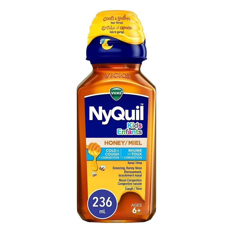 - NIGHTTIME COLD & COUGH + CONGESTION RELIEF FOR KIDS. Relieves your child’s sneezing, runny nose, and cough so your child can get the rest they need;FLAVOURED WITH REAL HONEY. Great-tasting honey flavour your child will love;NIGHTTIME RELIEF. Don’t let cold symptoms keep your child up. NyQuil Kid’s Honey RELIEVES your child’s cold, cough, and congestion symptoms so that they can get the rest they need;SPECIALLY FORMULATED FOR CHILDREN. Formulated free of alcohol, aspirin, acetaminophen, and high fructose corn syrup;FOR CHILDREN AGES 6 AND OLDER;FROM THE MAKERS OF VICKS. The world's #1 selling cough and cold OTC brand;TRUSTED BY PARENTS FOR OVER 125 YEARS to relieve kids' cough and cold symptoms