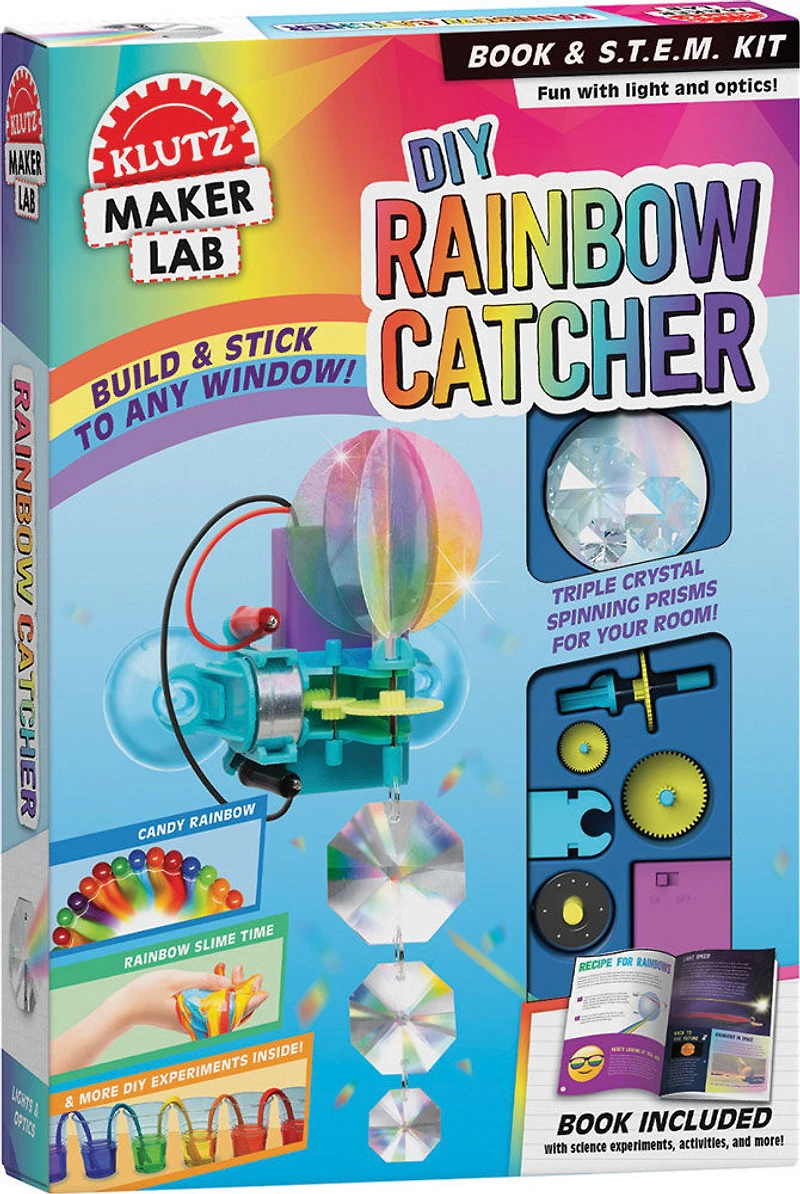 This clever snap-together rainbow maker catches sunlight and projects tiny rainbows into your room like a disco ball. The included book is chockfull of information about how rainbows form: the science of sunlight, prisms, and the very special weather conditions under which rainbows might appear. Activities and experiments include different ways you can mimic rainbow effects, including rainbow slime, a rainbow volcano, a rainbow bubble snake, and much, much more. Comes with: 3 clear crystals. 3 silver rings, 2 suction cups, 3 holographic plastic pieces, motor with wires, battery box with alligator clips, plastic gear box.