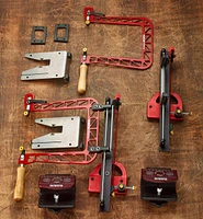 Specifically developed for marquetry work, each of these sets combines a Mk.IV 8" swivel fret saw, a guide tower that helps control the saw’s movement, and a bird’s-mouth work platform, along with one of two types of quick-release hardware for mounting the tower and platform to the edge of a workbench.