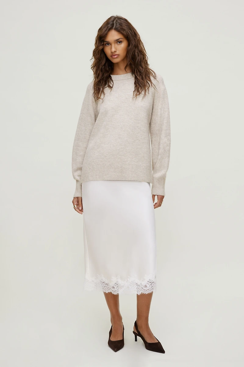 This skirt is made from silky satin with a hint of stretch for an effortless, flowy drape that moves with you. It's designed to sit at your waist with a relaxed fit and has a lace trim for a sultry touch. Style it with a