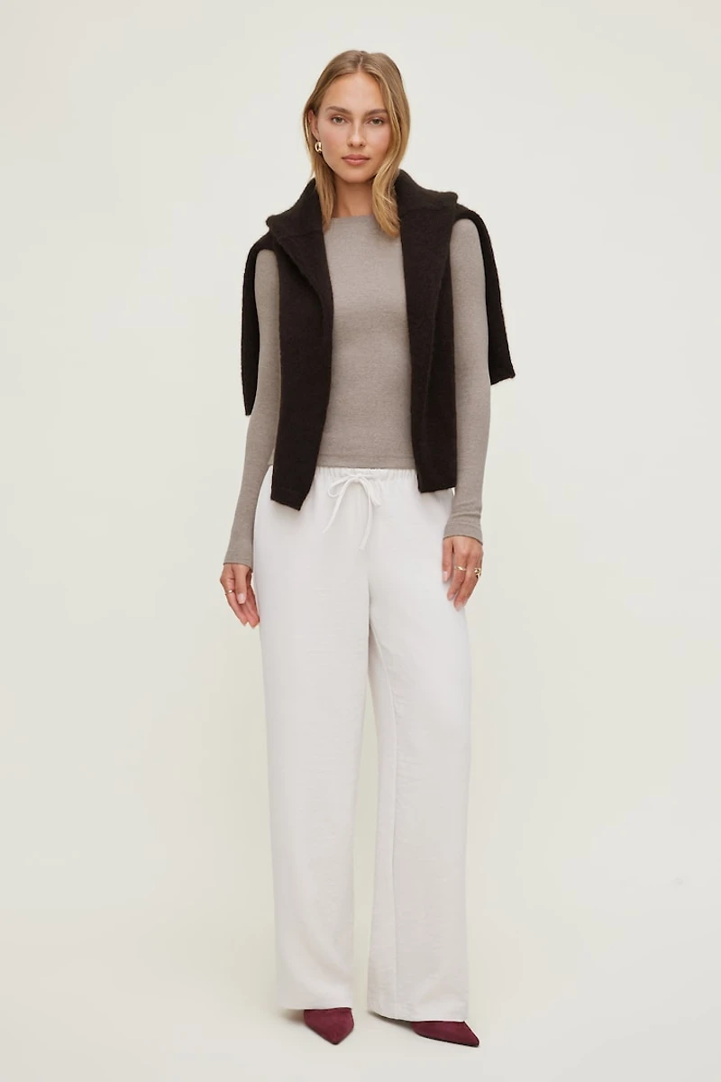 These pants are made from airflow—our flowy and lightweight crepe fabric with a subtle crinkle for a cool, polished feel. They're designed to sit below your belly button with a relaxed seat that flows into a drapey wide leg. Style them with a going out