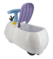 Adorable Olaf car plays fun sounds and has flashing lights! Includes rotating front wheel for extra steering stability! Simply lift seat cover for bonus storage under seat cover. Handle bar folds down for ease of storage. Safe and durable construction for hours of ridging fun.