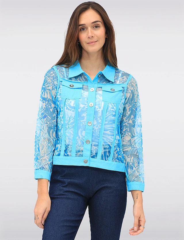 Lightweight Printed Mesh Jacket with Chest Pockets & Raw Edges by Tango Mango