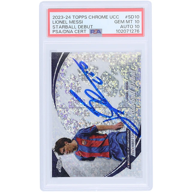 Lionel Messi Barcelone 2023-24 Topps Chrome UCC Starball Debut #SD-10 PSA Authentifié 10/10 Carte autographiée