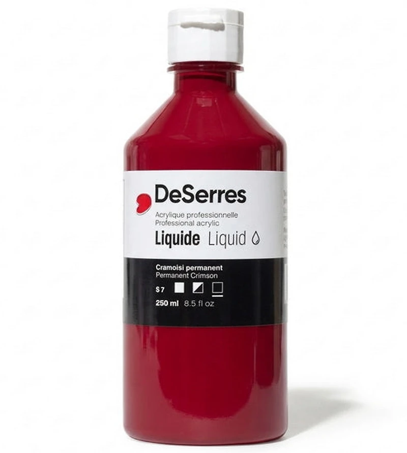 Dacryl Professional Liquid Acrylics are formulated to achieve maximum pigment concentration and colour intensity, consistent with excellent handling and stability properties. As no fillers or extenders are used in DeSerres Professional Liquid Acrylics, once dry, most colours dry to a natural gloss finish, while those with larger pigment particles offer more of a satin finish.These colours will not separate or settle in the jar and can be readily mixed with DeSerres mediums at any ratio, or with up to 50% water for increased transparency and cost efficiency. They dry to a flexible, water and light-resistant finish. Perfect for students and professionals.