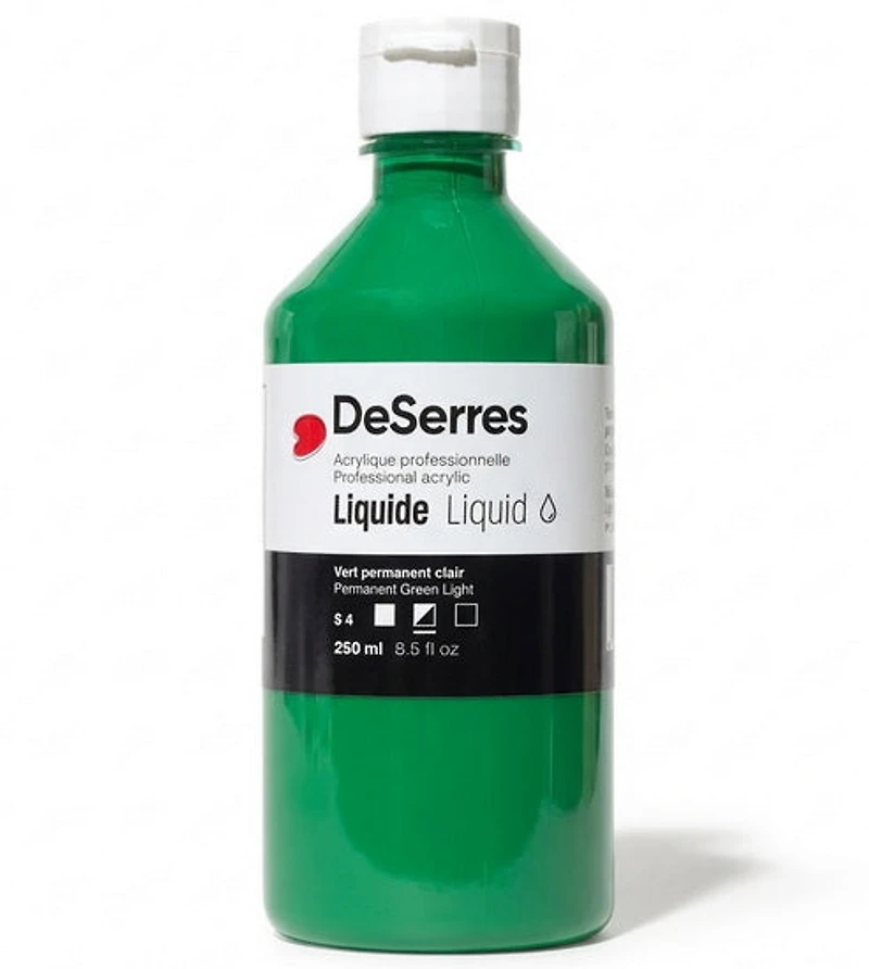 Discover Dacryl, a Canadian-made collection of acrylic painting essentials – made for local creatives. Dacryl Professional Liquid Acrylics are formulated to achieve maximum pigment concentration and colour intensity, consistent with excellent handling and stability properties. As no fillers or extenders are used in DeSerres Professional Liquid Acrylics, once dry, most colours dry to a natural gloss finish, while those with larger pigment particles offer more of a satin finish.These colours will not separate or settle in the jar and can be readily mixed with DeSerres mediums at any ratio, or with up to 50% water for increased transparency and cost efficiency. They dry to a flexible, water and light-resistant finish. Perfect for students and professionals.
