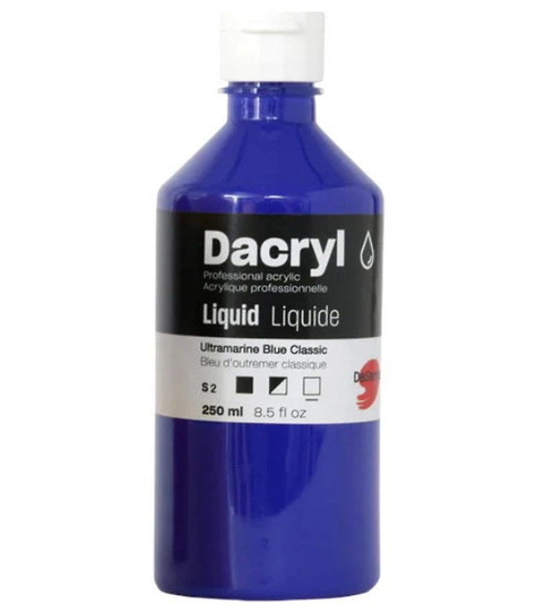 Dacryl Professional Liquid Acrylics are formulated to achieve maximum pigment concentration and colour intensity, consistent with excellent handling and stability properties. As no fillers or extenders are used in DeSerres Professional Liquid Acrylics, once dry, most colours dry to a natural gloss finish, while those with larger pigment particles offer more of a satin finish.These colours will not separate or settle in the jar and can be readily mixed with DeSerres mediums at any ratio, or with up to 50% water for increased transparency and cost efficiency. They dry to a flexible, water and light-resistant finish. Perfect for students and professionals.