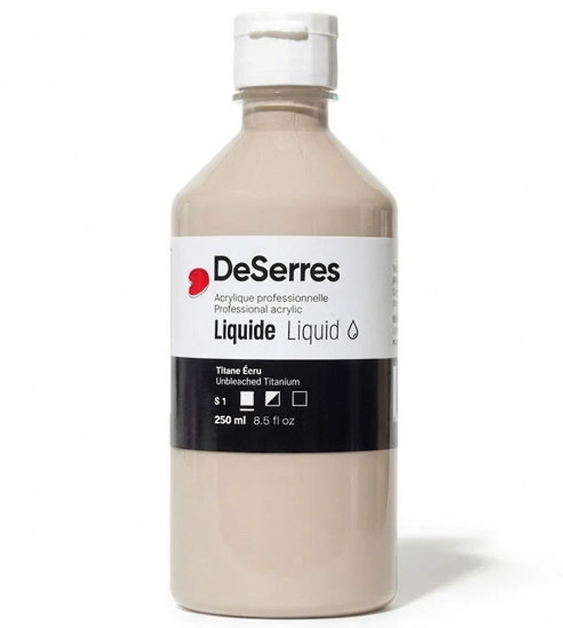 Dacryl Professional Liquid Acrylics are formulated to achieve maximum pigment concentration and colour intensity, consistent with excellent handling and stability properties. As no fillers or extenders are used in DeSerres Professional Liquid Acrylics, once dry, most colours dry to a natural gloss finish, while those with larger pigment particles offer more of a satin finish.These colours will not separate or settle in the jar and can be readily mixed with DeSerres mediums at any ratio, or with up to 50% water for increased transparency and cost efficiency. They dry to a flexible, water and light-resistant finish. Perfect for students and professionals.
