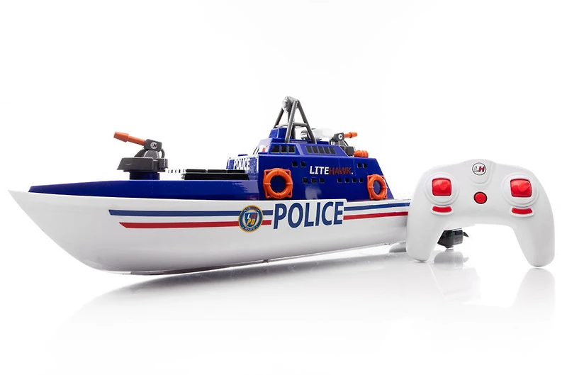 The boat includes a high-capacity rechargeable battery so your adventures last longer! With the 2.4ghz R/C system, you can play with multiple R/C vehicles simultaneously without the fear of losing control! This is a great companion for LITEHAWKS FIRE RESCUE BOAT. LITEHAWK'S all-new MARINE UNIT is the perfect pool or lake toy. Measuring over 22 inches long, this boat is highly detailed with working LED navigation and emergency lights. Building to the rescue theme, you can take control of the onboard searchlight and water cannon from the remote control! The water cannon shoots over 2ft! Dual motors and propellers and a durable hull ensure a smooth, controllable ride. The dual propellers on this rudderless boat use opposite thrusts to turn and maneuver.