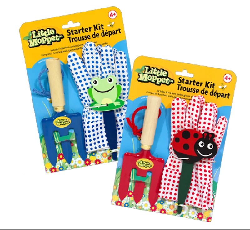 Little Moppet planting kits offer fun by having them sow and maintain their very own garden. What better way to get acquainted with the garden than with a delightful Garden Starter Kit. Each kit includes a pair of polka dot garden gloves, a sturdy metal hand fork and a wooden plant marker. One item per purchase