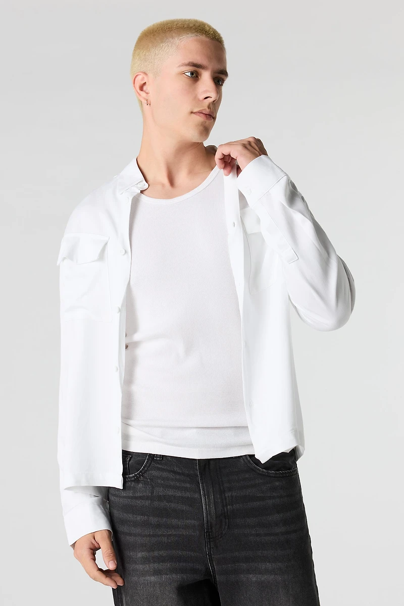 This top features button-up front, collared neckline, chest pockets, and long sleeves.