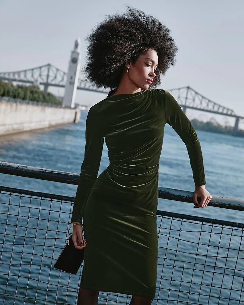 This elegant bodycon dress made in beautiful velvet is sure to make you stand out. A perfect dress for any festivities. - Stretch velvet - Unlined - Bodycon fit - Mock neckline - Long sleeves - Ruched details at neckline and waist - Back slit - Midi length
