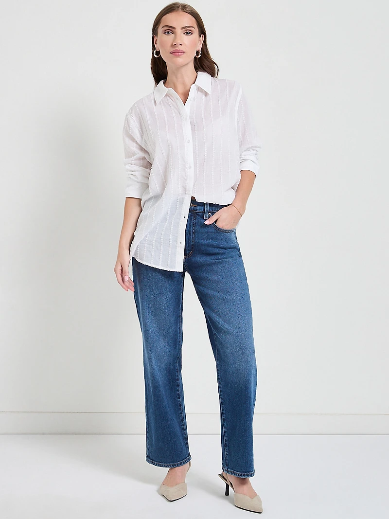 Get ready for Monday to feel like Friday in this laid-back, chic, tunic-length textured woven shirt. It has long roll-tab sleeves, a roomy relaxed fit, and button-front ease, plus playful stripes, a back yoke with inverted box pleat, and a flirty shirttail hem.