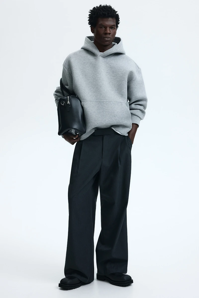 Loose-fit hoodie in scuba fabric with a generous but not oversized silhouette. Double-layered hood, a kangaroo pocket, dropped shoulders, and long sleeves. Wide trim at cuffs and hem.