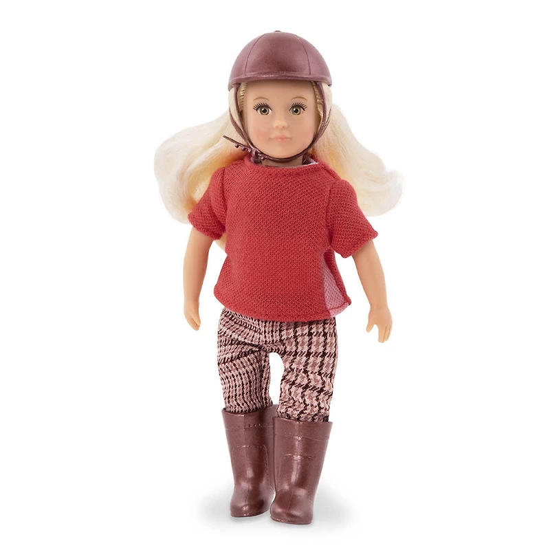 Enjoy a ride in the countryside with horseback riding doll Briella, a beautiful 6-inch doll with hazel eyes and long, wavy blonde hair that's fun to comb and style! This mini doll's best memory is when her mom took her riding for the first time, and she's loved horses ever since. Her outfit features a bright red T-shirt, a pair of plaid riding pants, boots, and her lucky helmet that always keeps her safe. Briella's dream is to compete in horse shows all over the world, and she plans on inviting all her friends to watch and support her. Come hang out with Briella and the Lori Dolls! (Horses sold separately.)