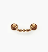Characterized by pearled borders, reeded handles and leaf motifs, these solid brass handles are typical of Louis XVI furniture and have an integral stop. Available in two sizes with an antique brass or antique bronze finish.