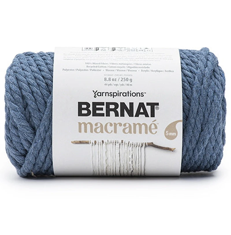 A new macramé yarn made partially with recycled cotton! With a variety of neutral and bold shades, beginners and experienced makers alike can create easy no-needle macramé home decor projects. From wall hangings to plant hangers, Bernat Macramé is perfect for adding a stylish boho touch to your home.Features: Content: 57% cotton, 39% viscose polyester, 4% other fibres Care: machine wash in cold water Weight: 250 g/8.8 oz Yardage: 40 m/44 yd Gauge: #6 Super Bulky Knitting gauge: 7 sts x 7 rows = 10 x 10 cm (4 x 4 in) Crochet gauge: 5 sc x 8 rows = 10 x 10 cm (4 x 4 in) Needle: 9 mm Hook: 10 mm