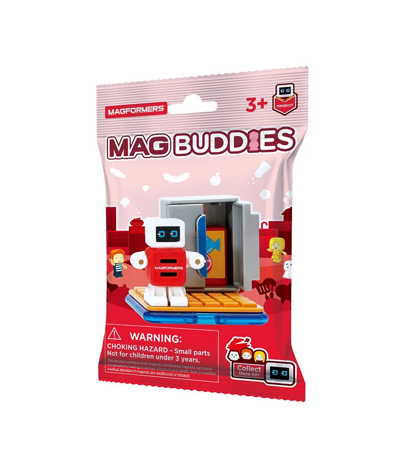 Discover Magformers Magbuddies character Minitbot the puppy. Build and play with Minibot and add to your Magformers collection. Arrives with 5 pieces. x1 Minibot, x1 Magnetic Square, x1 Square insert, x1 Refridgerator x1 Fish block.
