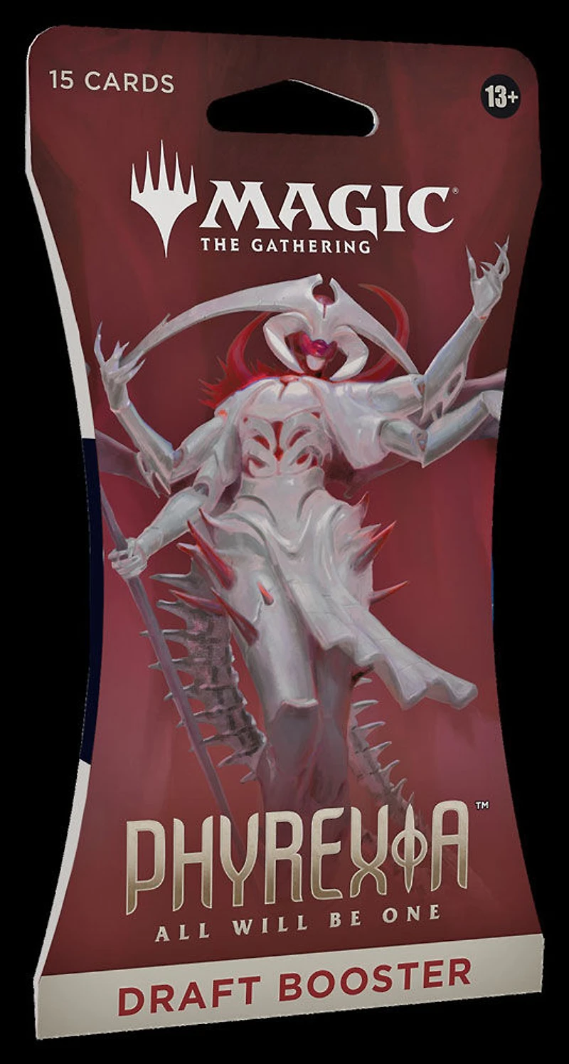 Each Phyrexia: All Will Be One Draft Booster contains 15 cards and 1 token/ad card, including 1 card of rarity Rare or higher and 3 Uncommons, 10 Commons, and 1 Land card. Traditional Foil Borderless Mythic Planeswalker in some of the boosters. Traditional Foil of any rarity replaces a Common in thirty-three percent of boosters.