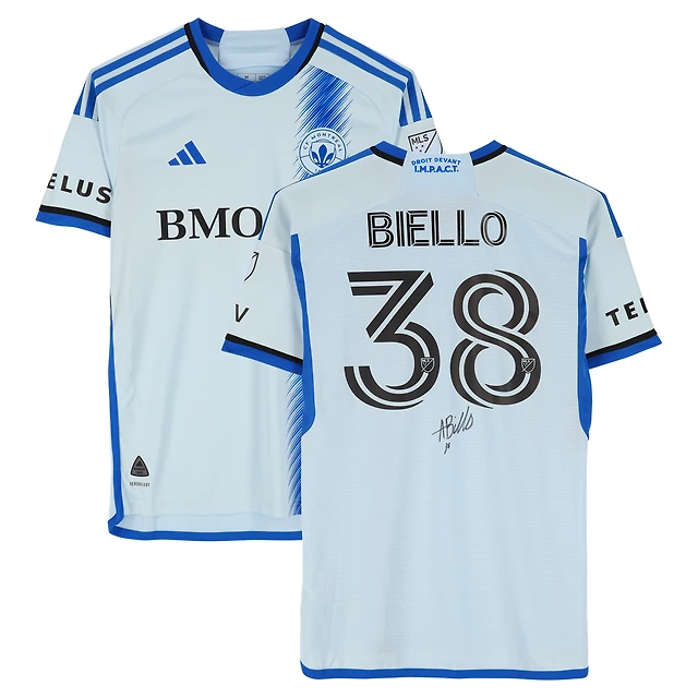 Maillot adidas bleu clair dédicacé par Alessandro Biello du CF Montréal, numéro 38, utilisé lors du match de la saison 2024 de la MLS - Taille M