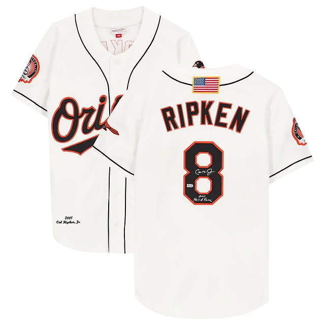 Maillot authentique autographié par Mitchell & Ness des Baltimore Orioles de Cal Ripken Jr. avec inscription « 2007 Hall of Fame »