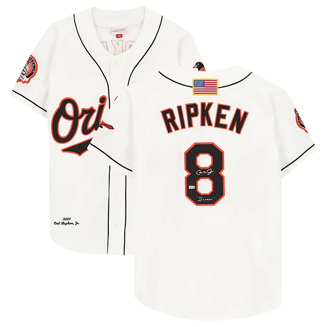Maillot authentique autographié par Mitchell & Ness des Baltimore Orioles de Cal Ripken Jr. avec inscription « Ironman »