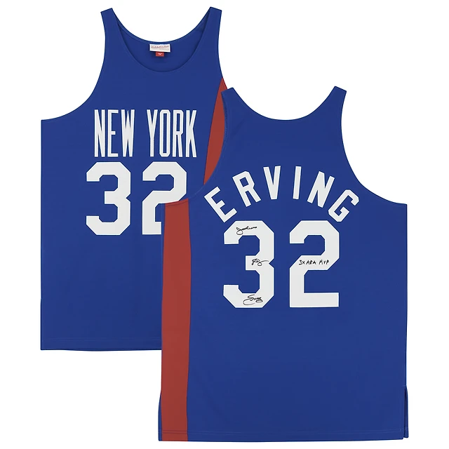 Maillot authentique dédicacé Mitchell & Ness 1973-74 bleu New York Nets de Julius Erving avec inscription « 3x ABA MVP »