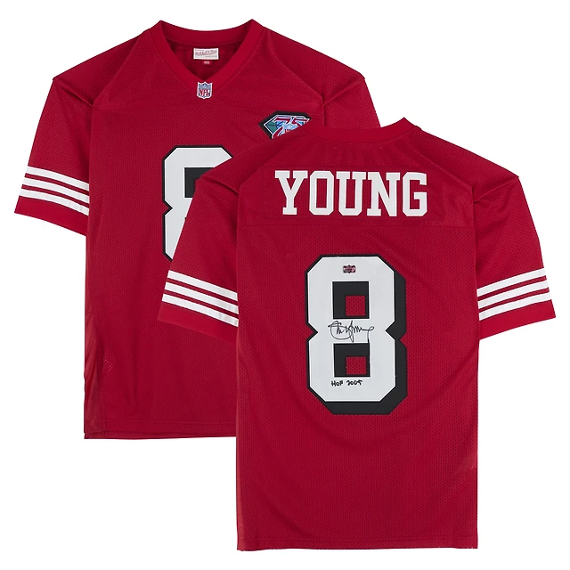 Maillot authentique rouge autographié par Steve Young des San Francisco 49ers, Mitchell/Ness, avec inscriptions « SB XXIX MVP, HOF 2005 ».