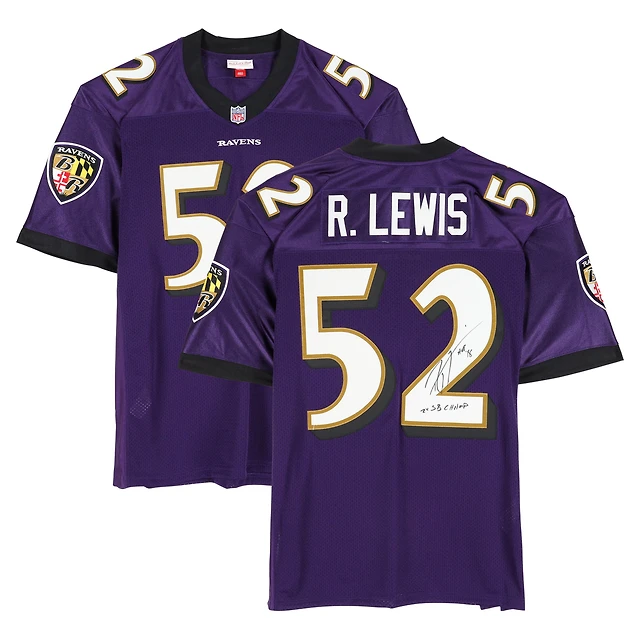 Maillot authentique violet autographié par Ray Lewis des Baltimore Ravens, Mitchell & Ness 2000