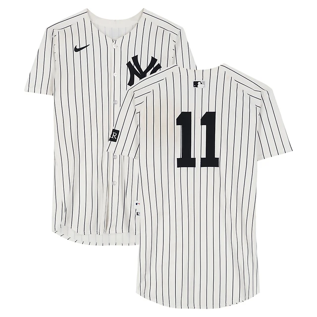 Maillot blanc à rayures fines n° 11 des Yankees de New York, Anthony Volpe, utilisé lors du match contre les Twins du Minnesota, le 13 août 2025.
