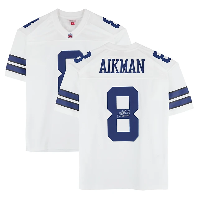 Maillot blanc dédicacé par Troy Aikman des Cowboys de Dallas, Mitchell & Ness, avec inscription « HOF 06 ».