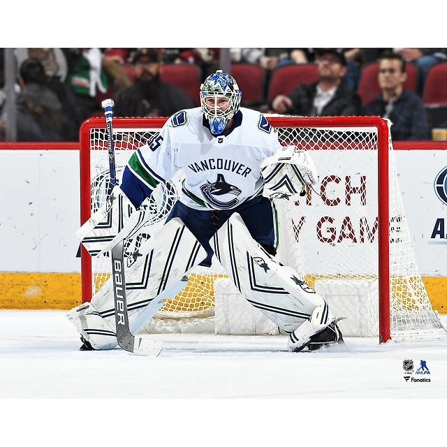 Maillot blanc non signé Thatcher Demko des Vancouver Canucks devant le filet