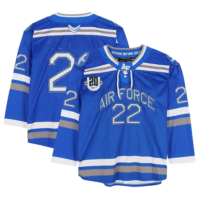 Maillot bleu n° 22 de l'équipe des Falcons de l'Air Force avec écusson du 20e anniversaire du programme de hockey