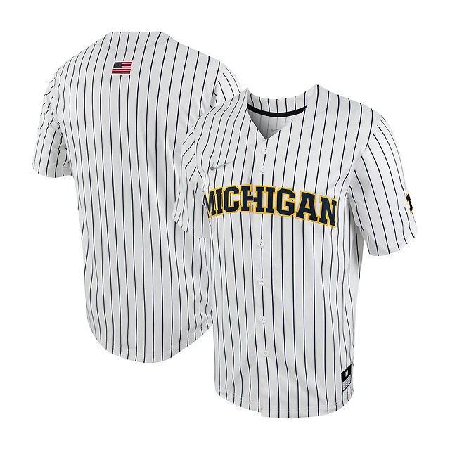 Maillot de baseball Nike pour homme, réplique à fines rayures des Michigan Wolverines, blanc/bleu marine, boutonné sur toute la longueur
