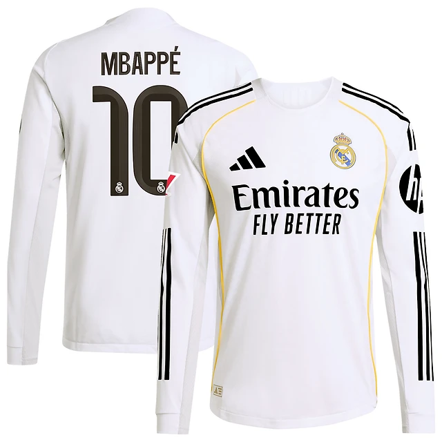 Maillot de joueur à manches longues authentique blanc adidas Kylian Mbappé domicile Real Madrid 2025/26 pour homme