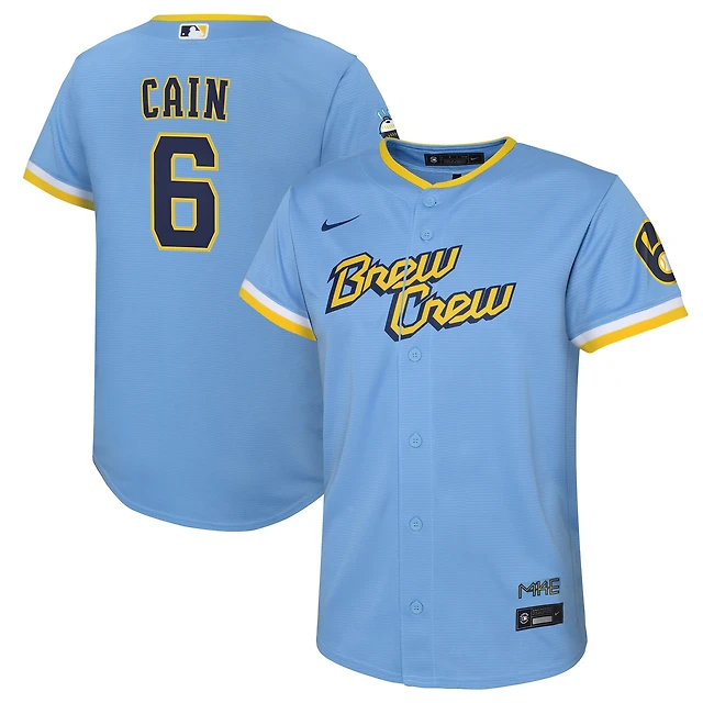 Maillot de joueur réplique Nike Lorenzo Cain pour jeunes Milwaukee Brewers City Connect bleu poudre
